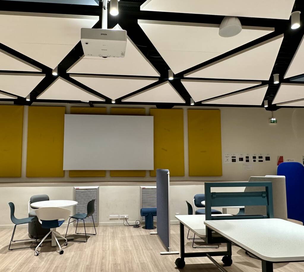 L’installation comprend un vidéoprojecteur laser, un écran cadre sans bord CINEVISION, et un support plafond VOGEL’S, garantissant une excellente qualité visuelle pour les cours et les présentations.